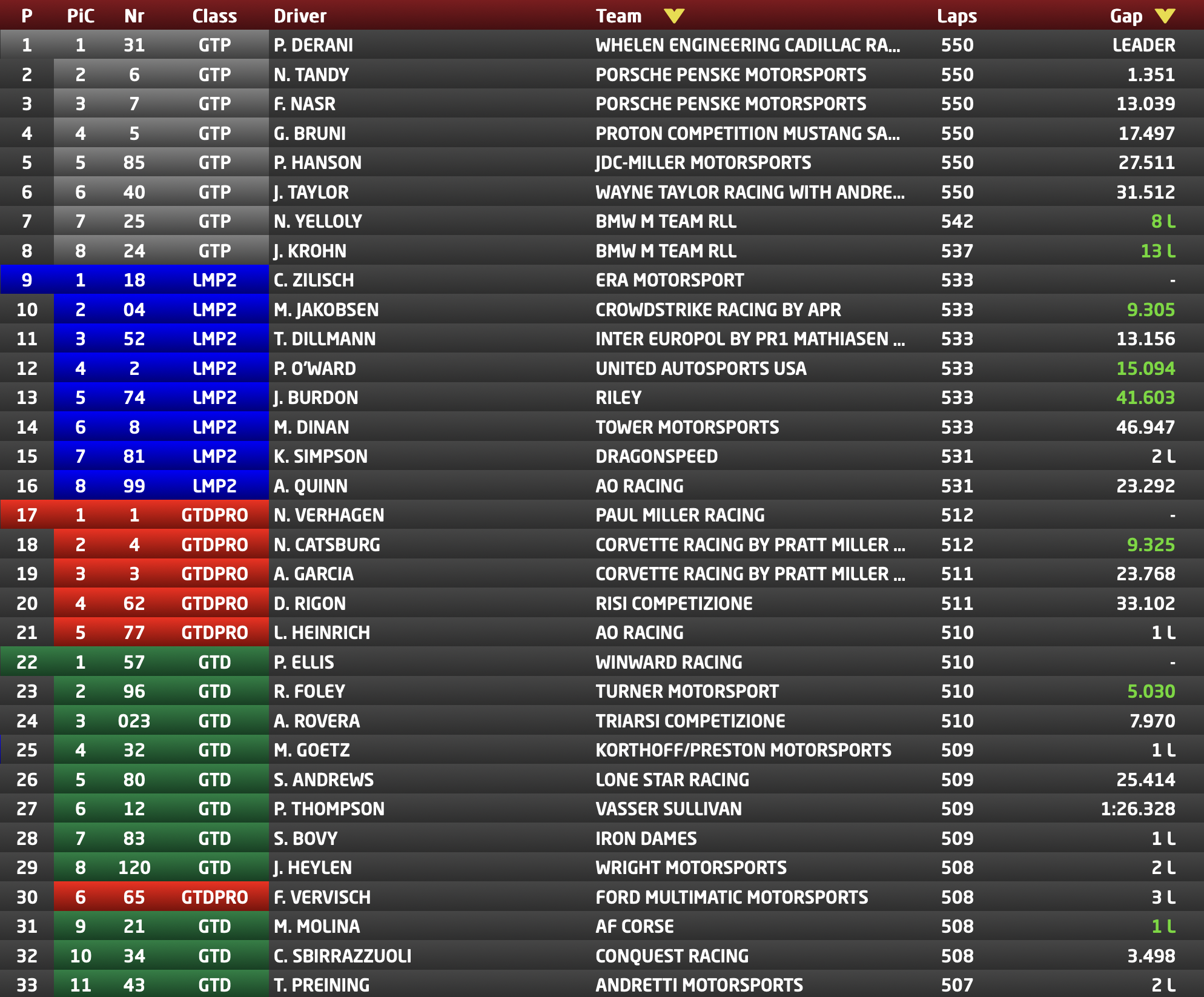 • 12h00 : Drapeau vert. La course reprend des droits sous l’impulsion de la Cadillac n°31/AX Racing, menacée par l’Acura n°40/WTR with Andretti ainsi que les deux Porsche officielles.