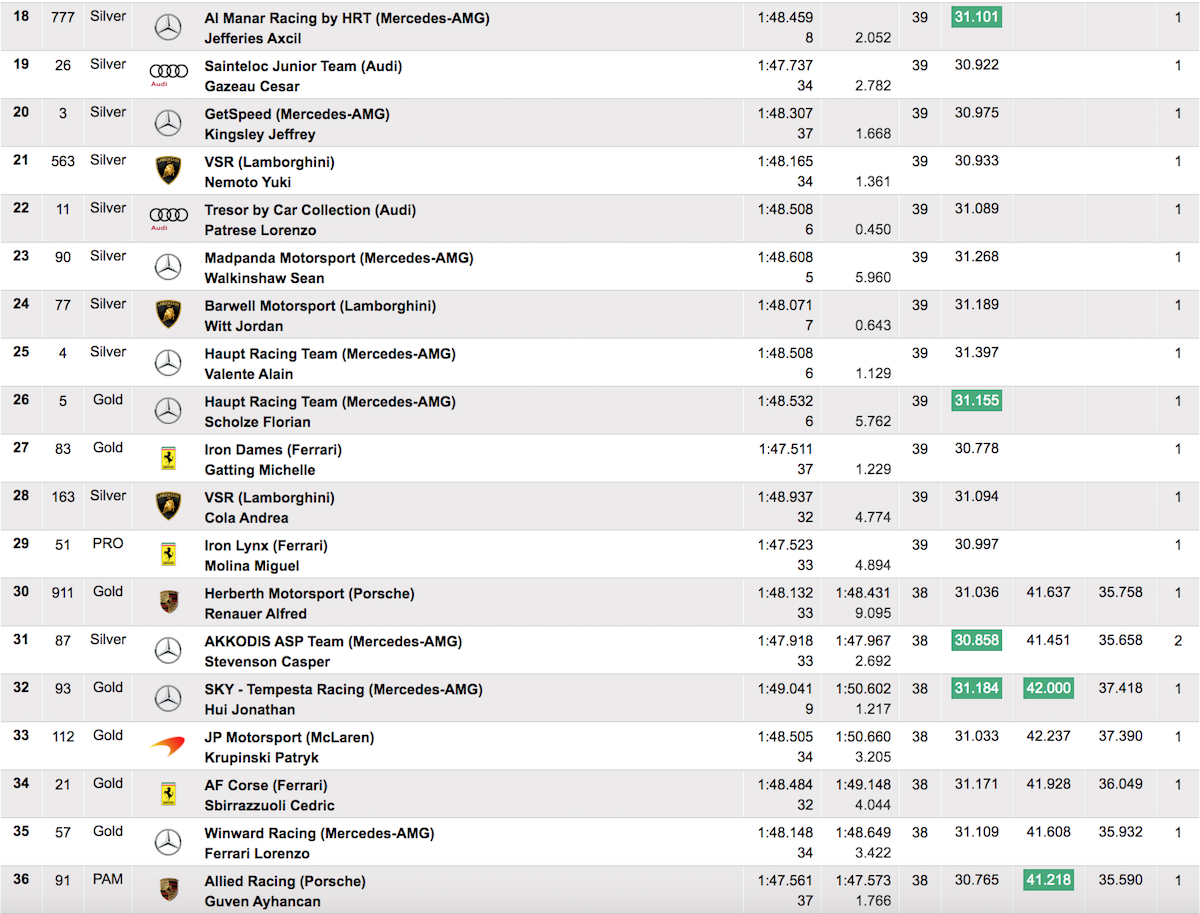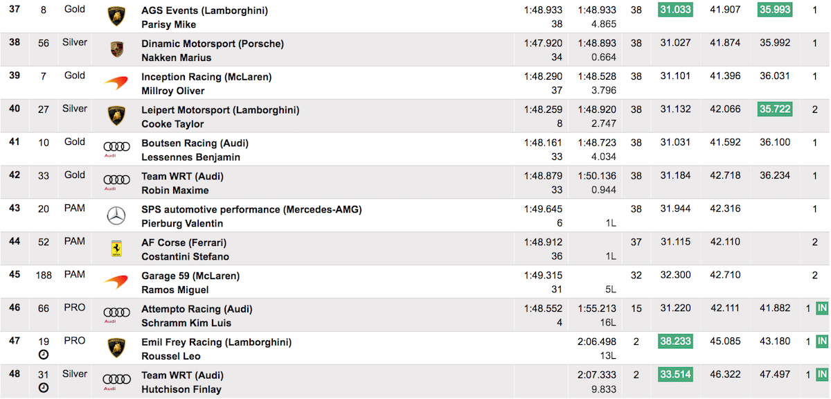 Le quinté de tête est complété par Manuel Maldonado dans la Mclaren 720S GT3 #188 du team Garage 59, leader de la catégorie Silver, et Ricardo Feller au volant de l’Audi R8 LMS GT3 #32 du team WRT.