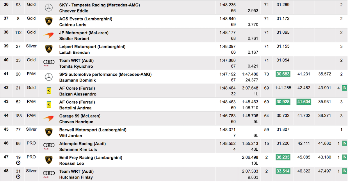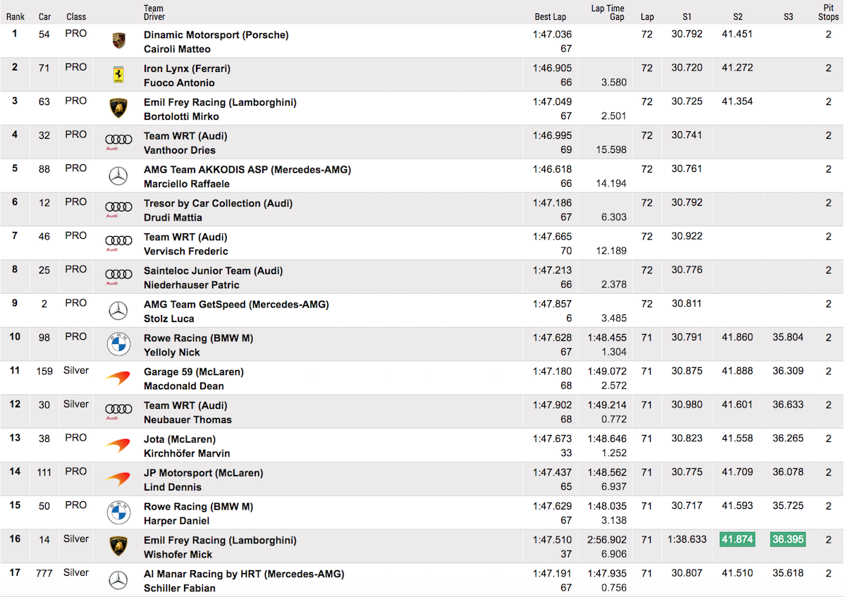 On retrouve cinq marques aux cinq premières places avec la quatrième place occupée par Dries Vanthoor au volant de l’Audi R8 LMS GT3 #32 du team WRT, à vingt secondes des leaders. Rafaelle Marciello complète le top cinq dans la Mercedes AMG GT3 #88 du team Akkodis ASP.