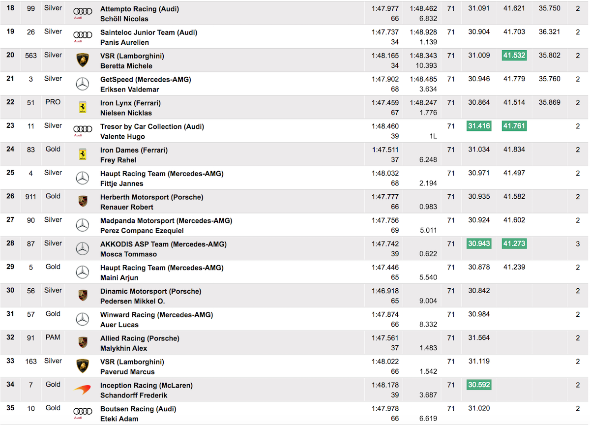 Dans la catégorie Silver, la tête de la course est occupée par Dean Macdonald dans la Mclaren 720S GT3 #159 du team Garage 59, neuvième du classement général. Deuxième place pour Thomas neubauer dans l’Audi R8 LMS GT3 #30 du team WRT, devant les vainqueurs de la dernière course à Hockenheim, la Lamborghini Huracan GT3/Emil Frey Racing #14 de Mick Wishofer.