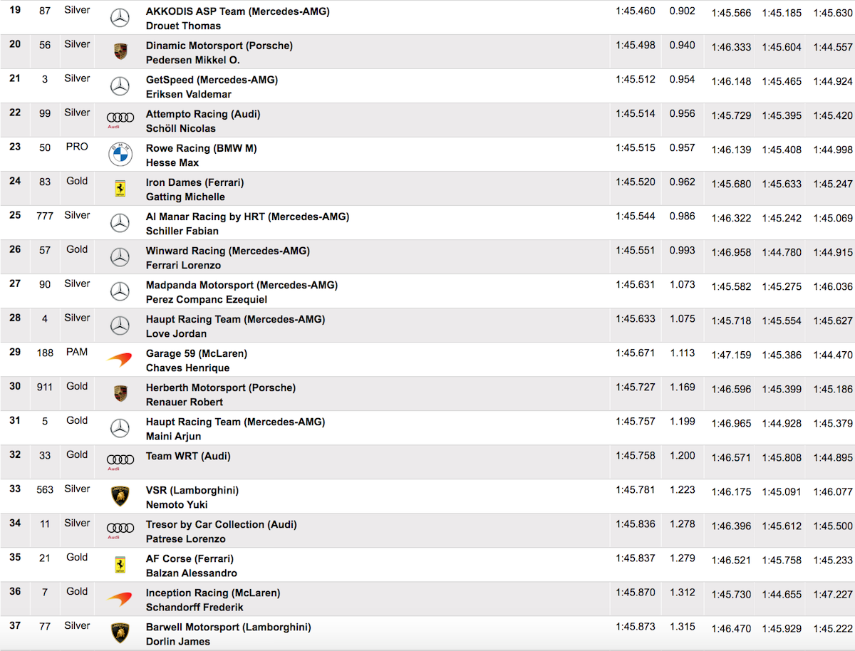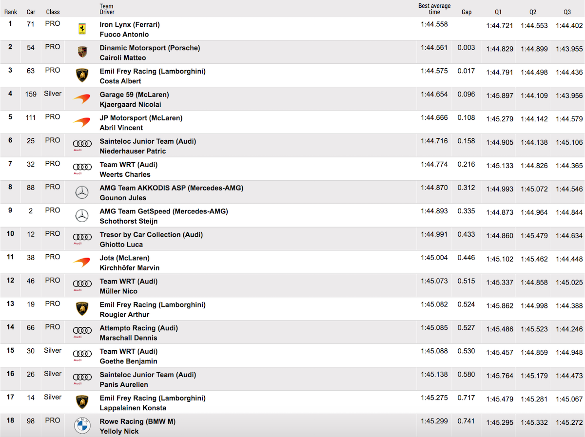 Troisième temps à 0.017 seconde pour Albert Costa, Jack Aitken et Mirko Bortolotti dans la Lamborghini Huracan GT3 #63 du team Emil Frey Racing, devant la Mclaren 720S GT3 #159 du team Garage 59 de Nicolai Kjaergaard, Manuel Maldonado et Dean Macdonald, meilleur temps dans la catégorie Silver (1:44.654). Le quinté de tête est complété par une autre Mclaren 720S GT3, la #111 du team JP Motorsport pilotée par Vincent Abril, Christian Klien et Dennis Lind à 0.108 seconde de la pole.