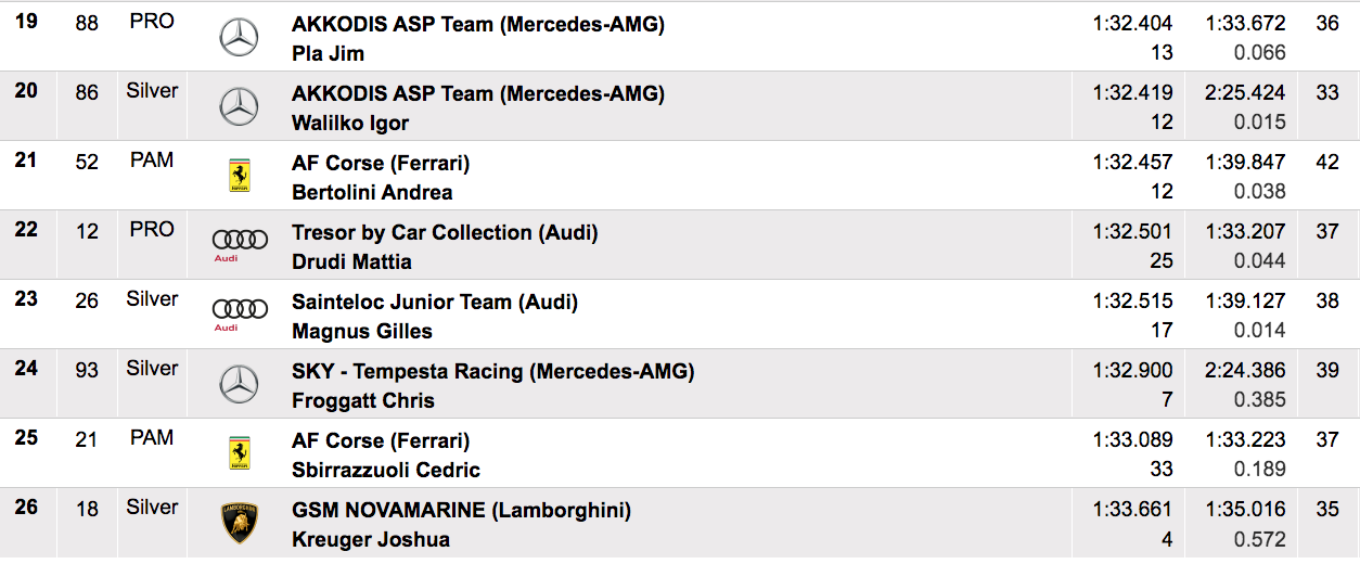 Christopher Mies signe le quatrième temps à 0.288 seconde au volant de l’Audi R8 LMS GT3 #33 du team WRT, devant Pierre-Alexandre Jean, cinquième du général, et meilleur temps de la catégorie Silver dans le baquet de la Ferrari 488 GT3 #53 du team AF Corse.