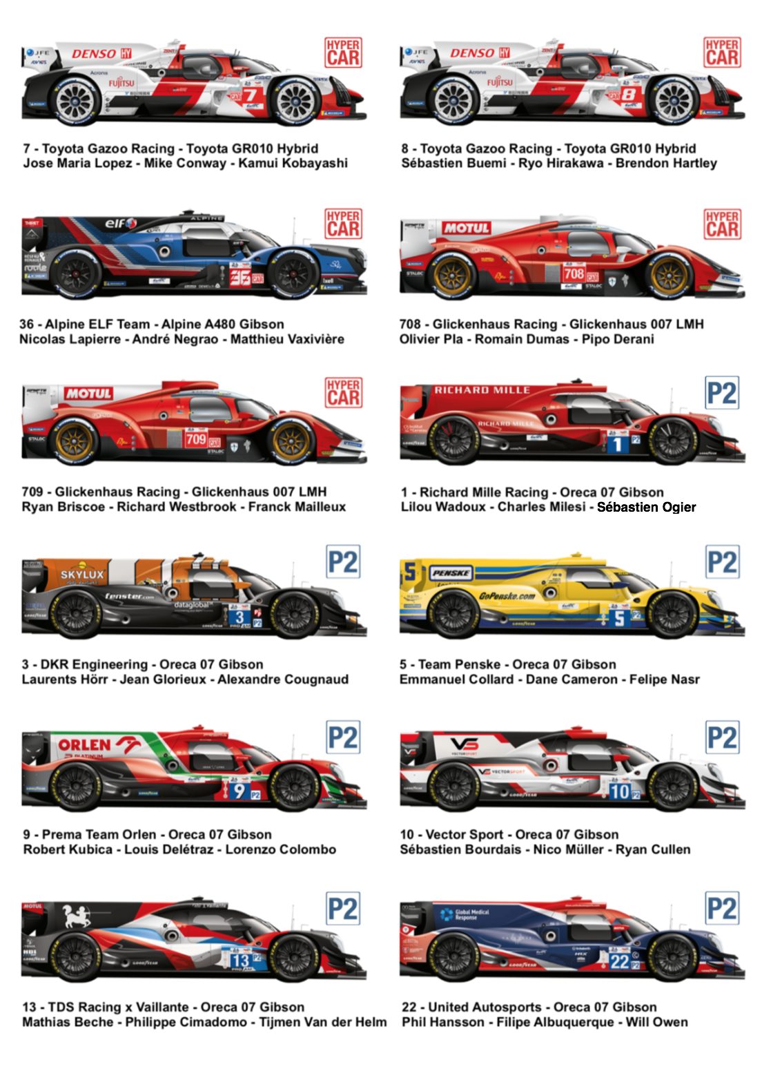 Retrouvez le spotter guide des 24 Heures du Mans 2022, avec les 62 équipages engagés et les 186 pilotes qui prendront le départ de cette 90e édition.