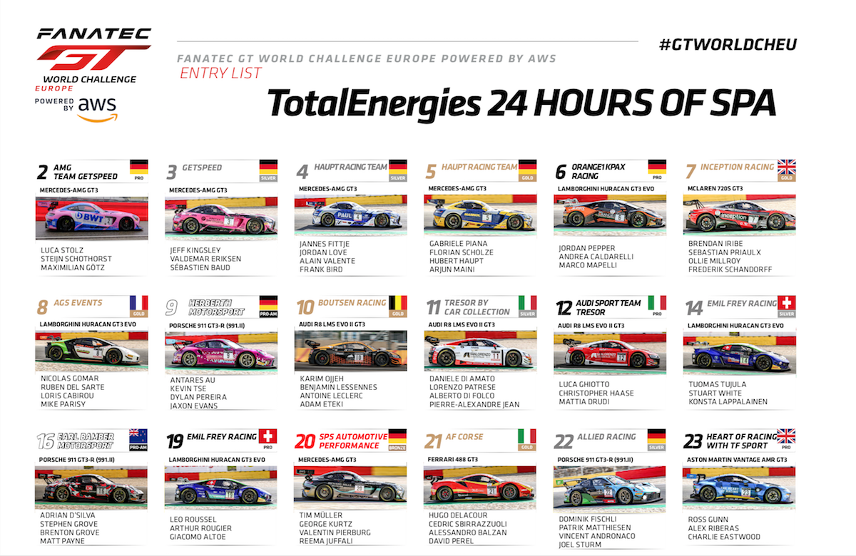 Retrouvez le spotter guide des TotalEnergies 24 Heures de Spa 2022, sommet de la saison Fanatec GT World Challenge Europe powered by AWS.