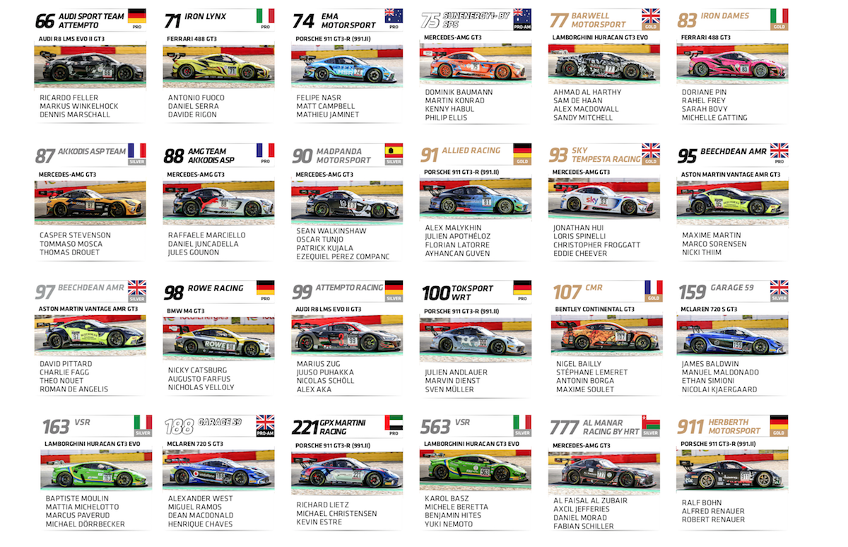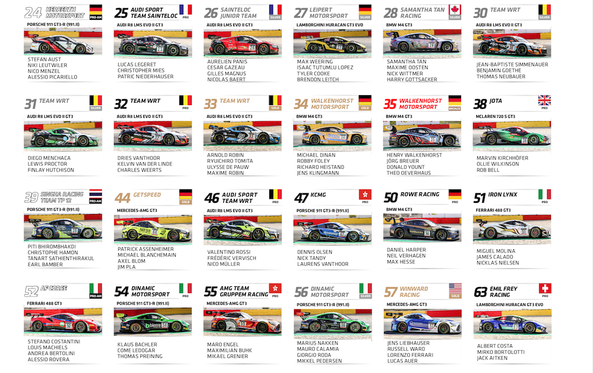 On retrouve 23 voitures engagées dans la catégorie Pro Cup, 19 en Silver Cup, 15 en Gold Cup, 7 en Pro-Am Cup et 2 en Bronze Cup, pour un total de 66 voitures au départ.